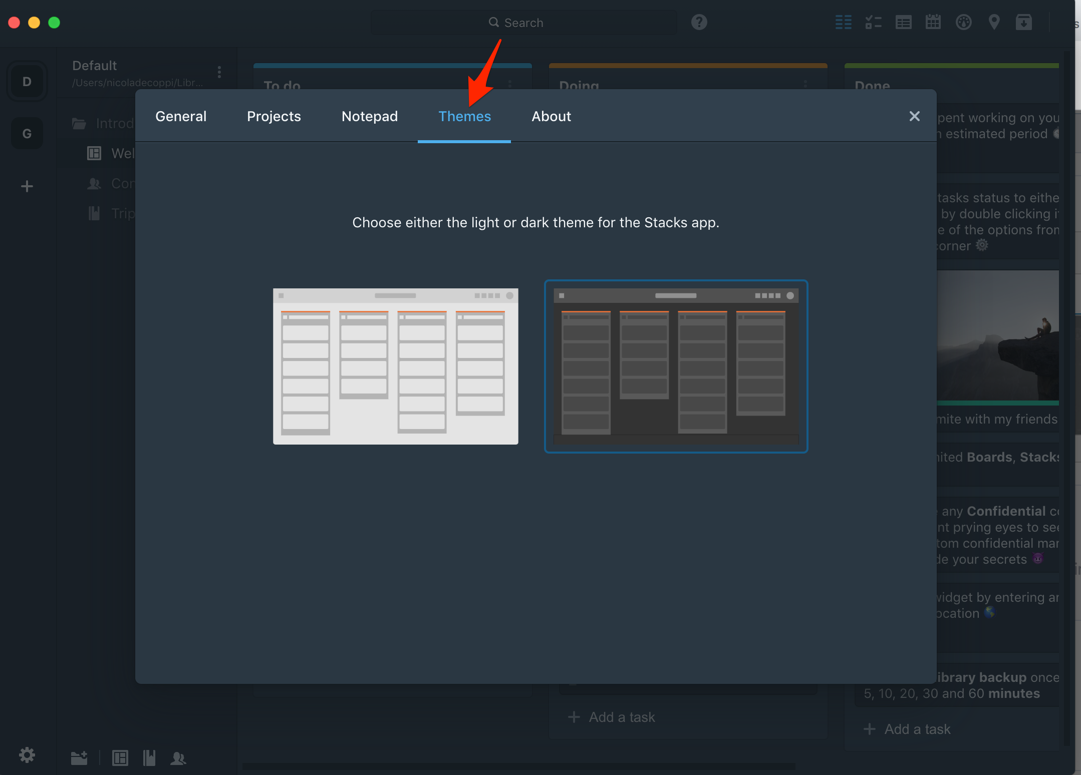 2. In the Preferences, click on the Themes tab, then choose Themes you want between light and dark.