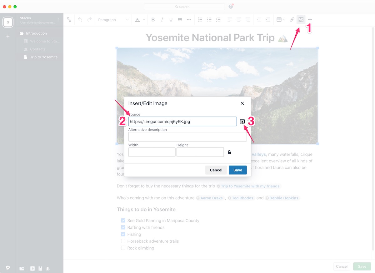 2. Click the Image icon in the toolbar (1) and either add an image URL (2) or click the upload button (3)