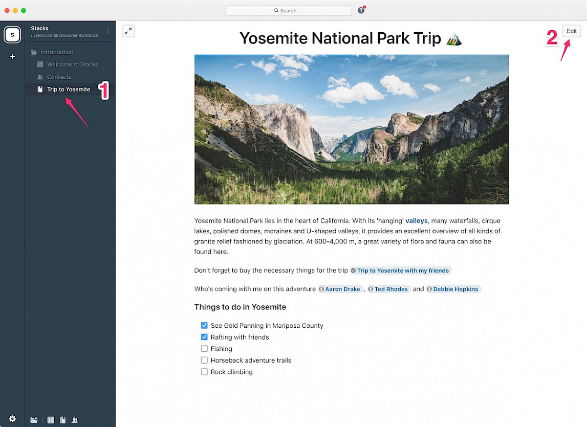 1. Select the notebook document (1) where you want to attach an image and click the Edit (2) button
