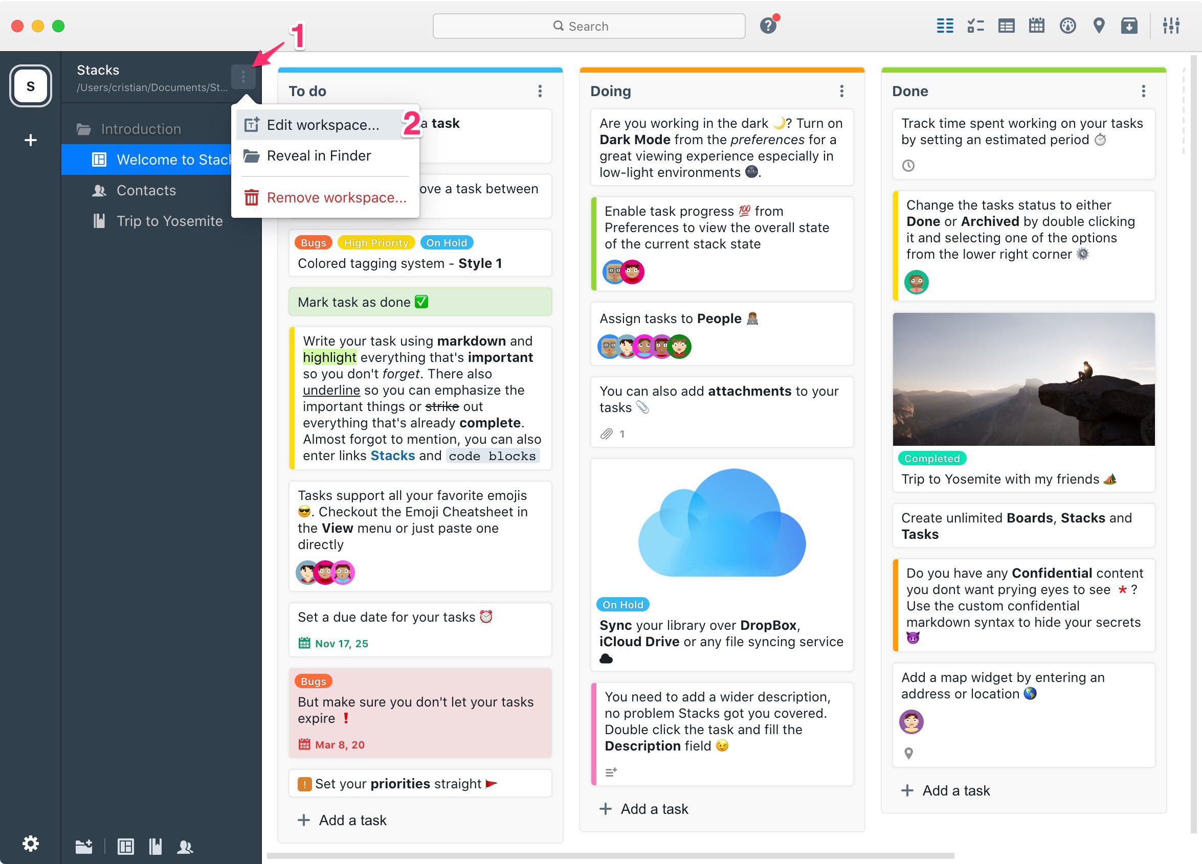 1. Click on the wokspace options button (1) in the top right corner of the Sidebar and click on Edit workspace (2).