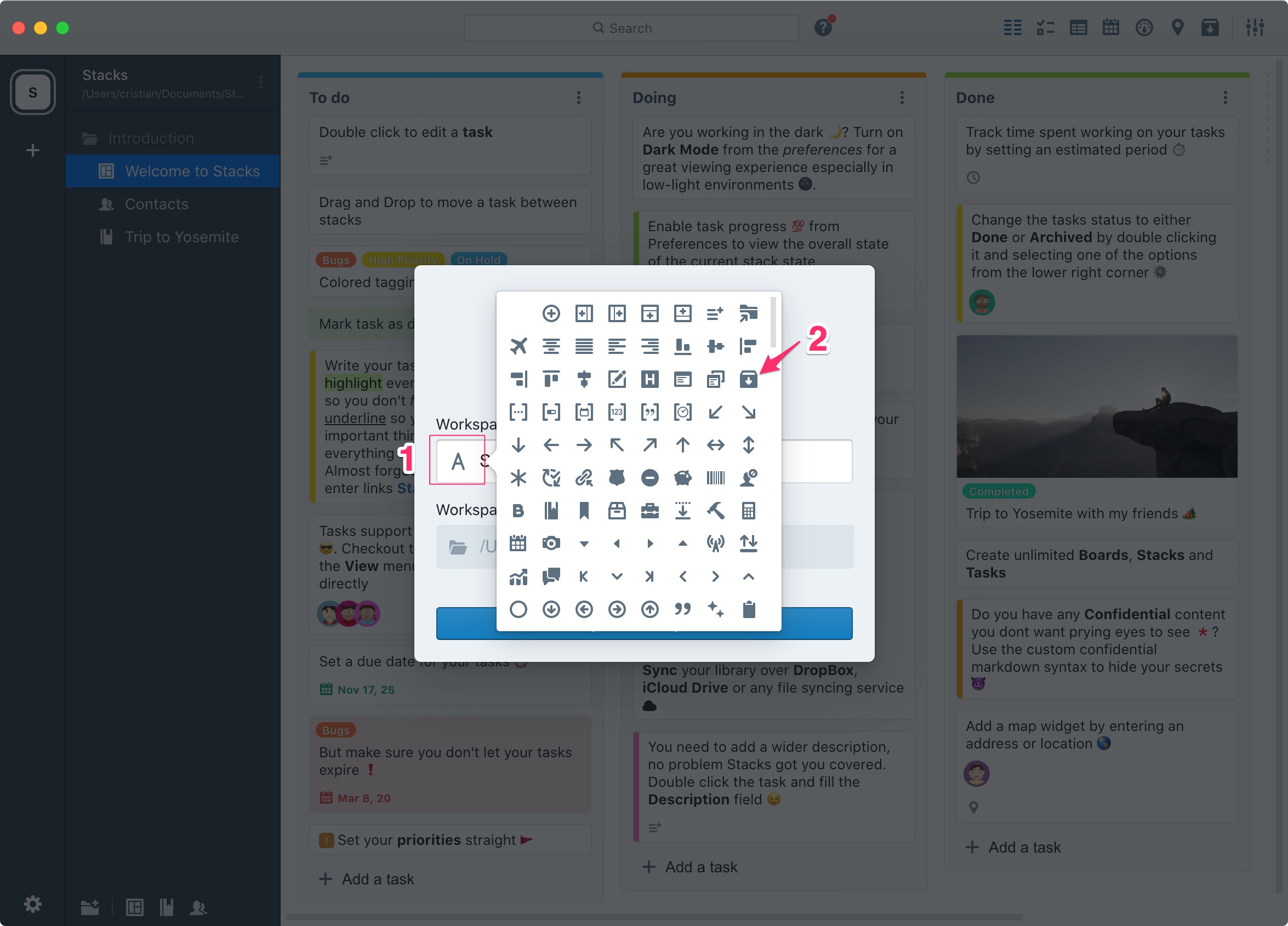2. Click on the button on the left hand side of the Workspace name (1) and select either a new icon from the popover (2) or choose the first empty icon for resetting to default.